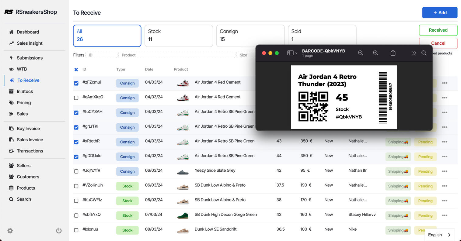 Optimize your inventory management with our dashboard, allowing precise tracking of purchases, stocks, deposits and sales. Generate labels on your products containing unique QR Codes and GTINs of your products to track your products at any time.